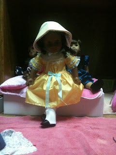 Cecile: My Summer Dress has these three items. My Beautiful yellow dress, with a blue bow and blue ruffles. A pretty sun-bonnet with designs on the inside, and white shoes with black buttons! All framed for the time of 1853. :)