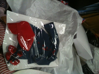 Also from Aunt Annette and hand-sewn: WHAT A CUTE OUTFIT! A red hat, a red shirt, a cute jacket, an adorable jean-skirt, and shoes! (they fit me!)
