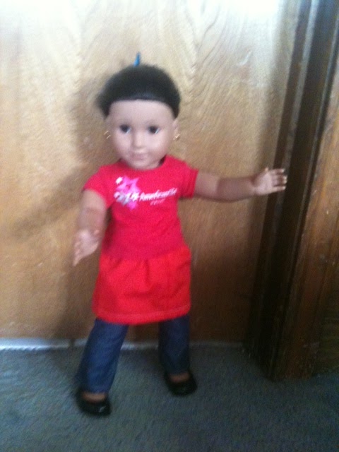 Hola! Josefina here! Here I am wearing the American Girl Tee, a home-made skirt my mom made, Molly’s Mary-Jane’s, and the Skinny Jeans for dolls. My hair is pulled into a high braid! Once again, cr-r-rasy and CUTE!