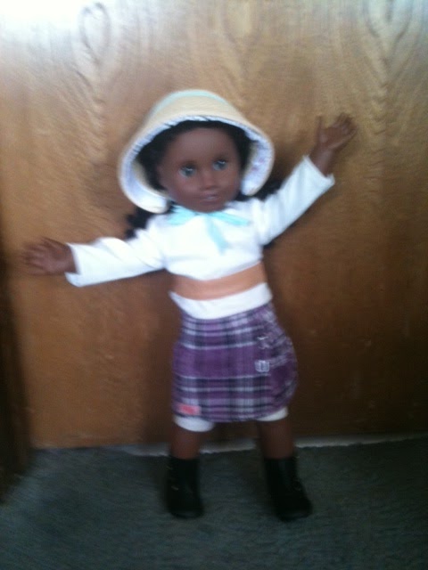 Over your star-struckness? Mom’s brother picked out the shirt from the DreamWorldCollections outfit Molly won, the skirt from an Our Generation outfit: Hally’s Read and Play outfit, to be exact. Who’s Hally? Some Our Generation character, I think. The pants I’m wearing are the pants from the Snow Flurry Outfit from AG, The bonnet I’m wearing is MY bonnet from My Summer Outfit, and the shoes I’m wearing are the boots form my ‘meet outfit’.